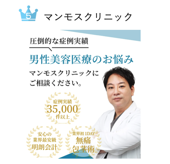 大宮で最も信頼できる包茎クリニック第5位は、幅広いメンズ美容医療が受けられる『マンモスクリニック』です。