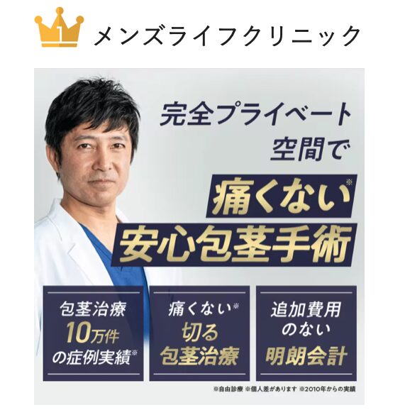大宮で最も信頼できる包茎クリニック第1位は、手術実績10万件以上(*1)を誇る『メンズライフクリニック』です。