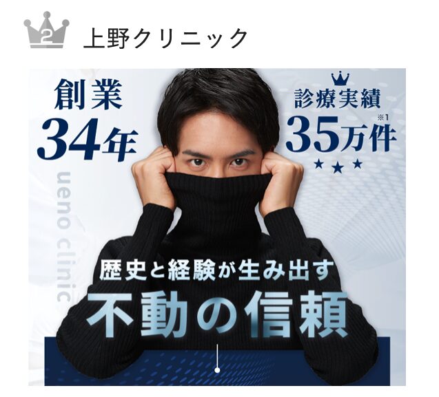 大宮で最も信頼できる包茎クリニック第2位は、雑誌やCMなどでおなじみの『上野クリニック』です。