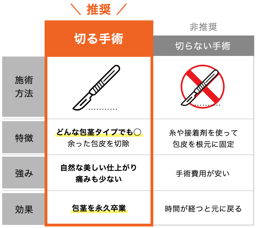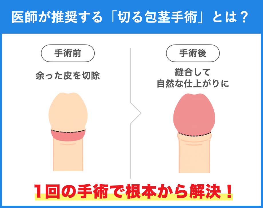 そのため、本気で包茎を治したいなら、余分な皮をしっかり取り除く「切る包茎手術」が必要です。