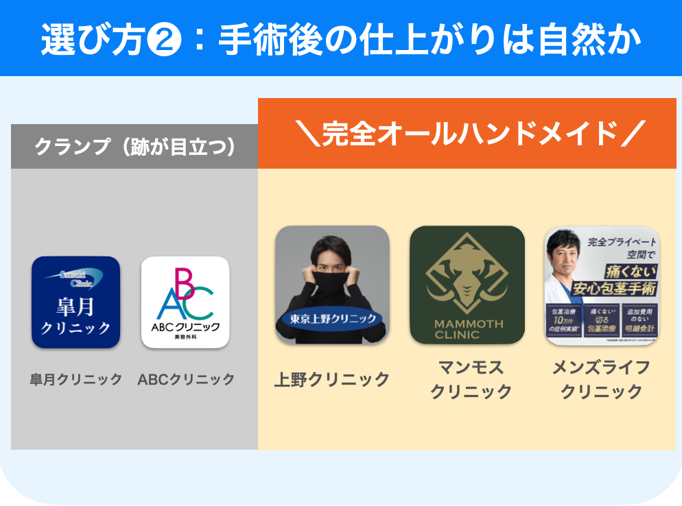 せっかく包茎手術をしたのに恥ずかしい仕上がりにならないよう、必ず『完全ハンドメイド』で手術してくれるクリニックを選びましょう。