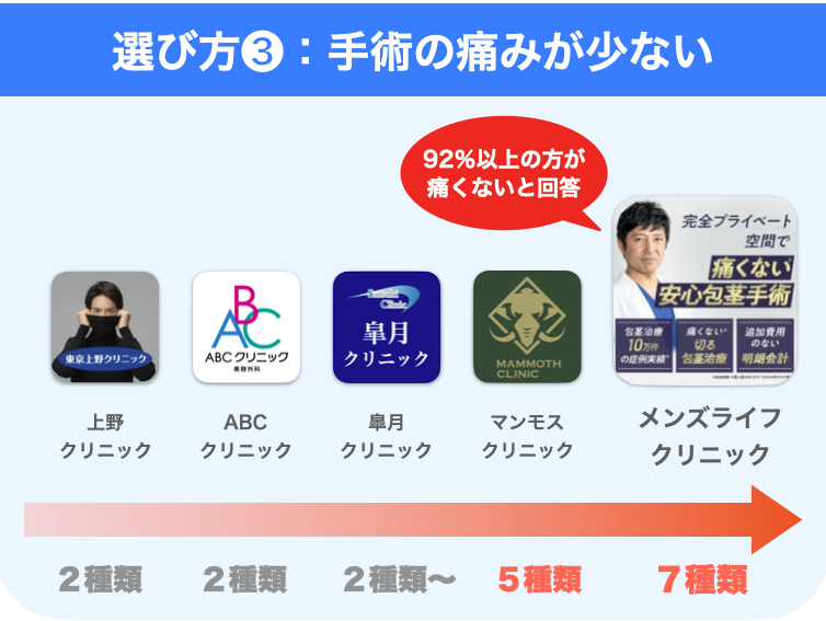 一番の特徴は、5種類の麻酔技術で痛みを限りなく抑えた包茎手術を実現しているところになります。