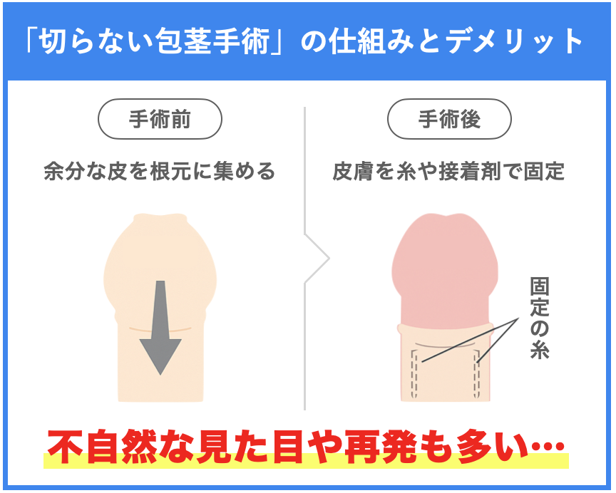 SNSでよく見る「切らない包茎手術や安すぎる手術」は、一見ラクそうに思えますが、実は根本的な解決にはならず、再発するケースが多いのが現実です。
