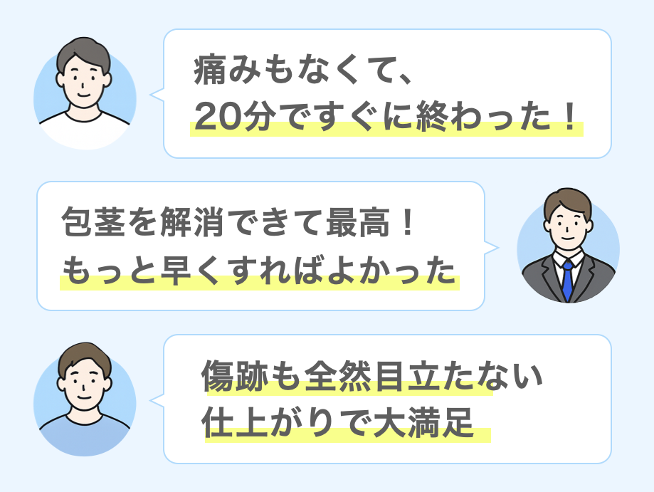 ですが、正しいクリニック選びができれば、痛みほとんど感じず、日帰りもできるくらい気軽に包茎を治すことができます。