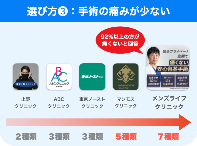 一番の特徴は、5種類の麻酔技術で痛みを限りなく抑えた包茎手術を実現しているところになります。