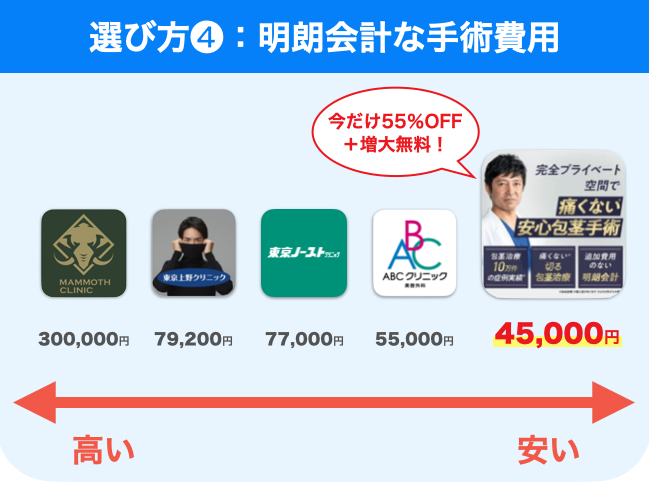 包茎手術クリニックを選ぶ際は、手術費用が相場内で、明朗会計のところを選ぶのがおすすめです。
