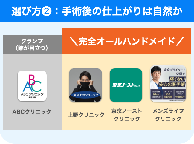 せっかく包茎手術をしたのに恥ずかしい仕上がりにならないよう、必ず『完全ハンドメイド』で手術してくれるクリニックを選びましょう。