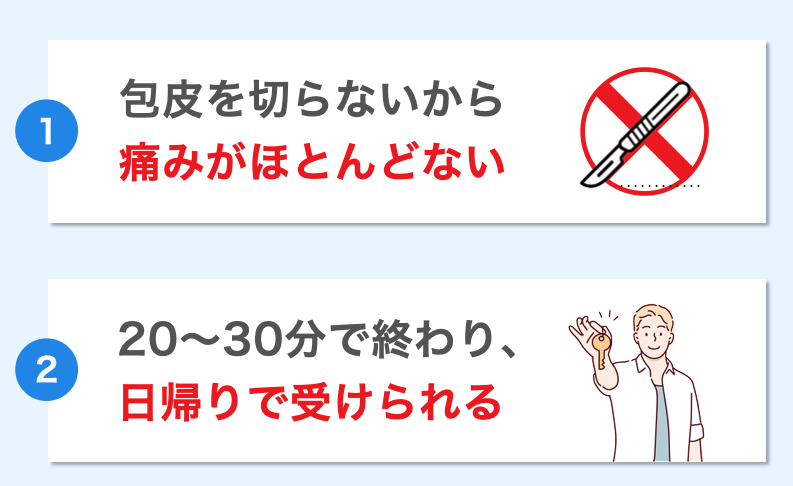 しかも、最近の包茎治療なら痛みもなく、日帰りですぐに治療することができるのも嬉しいポイントです。