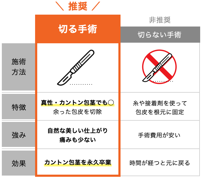 SNSでよく見る「切らない包茎手術や安すぎる手術」は、一見ラクそうに思えますが、真性包茎では対応できない場合がほとんどです。
